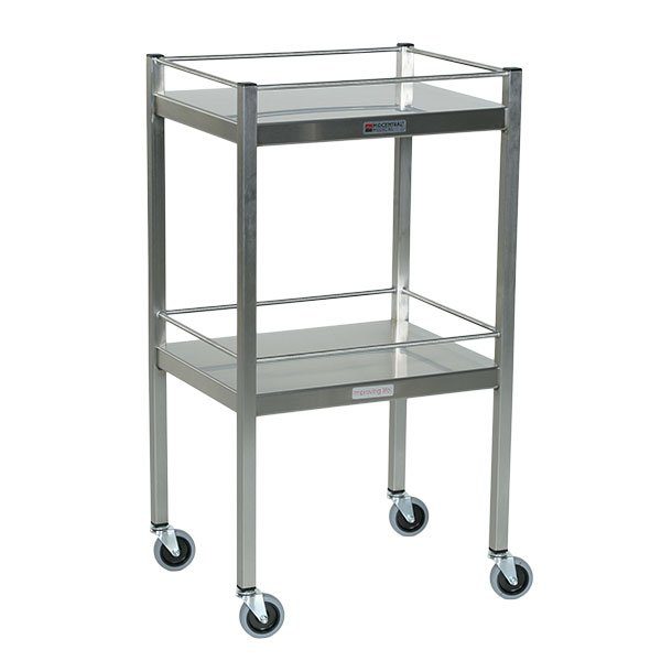 SS Utility Table 16″w x 20″l x 34″H, with 4-Sided Guardrail on top and shelf