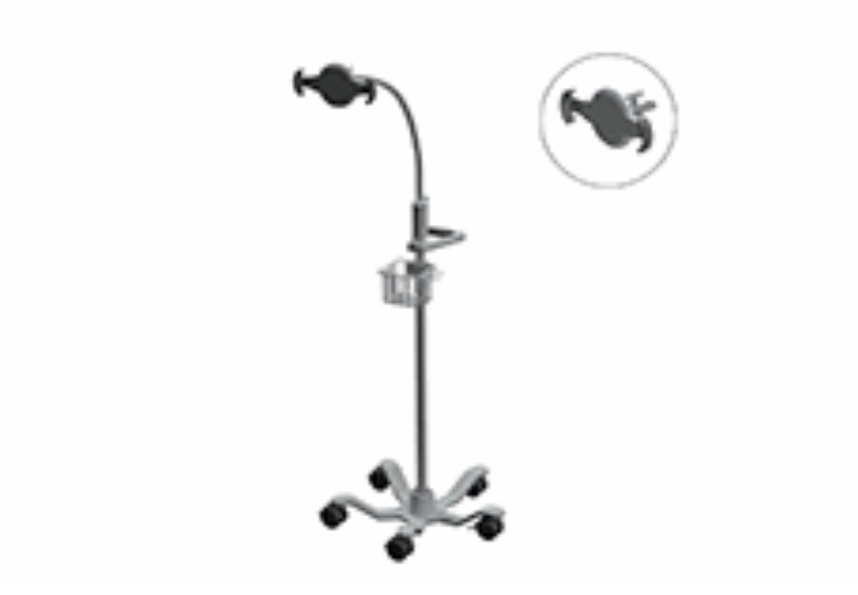 Tablet Roll Stand with Locking Tablet Holder on Gooseneck; For Tablets 11-13.5″ Diagonal x Up to .8″ Deep; with Push/Pull Handle and 5 x 5″ x 4″ Deep Basket